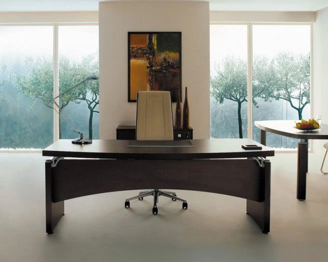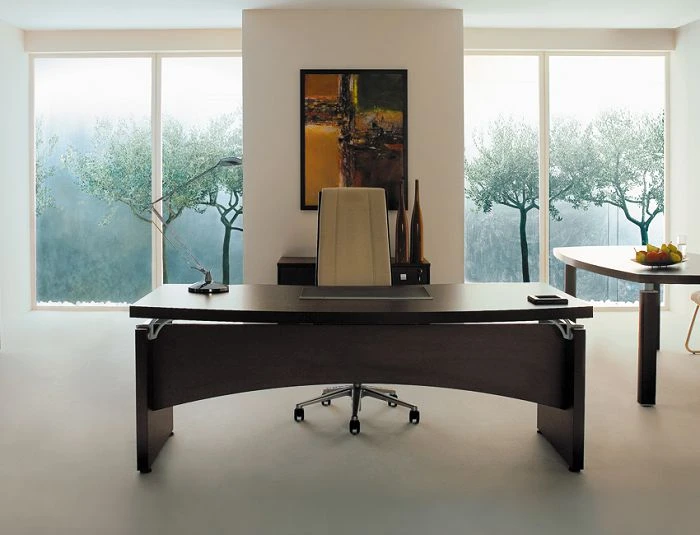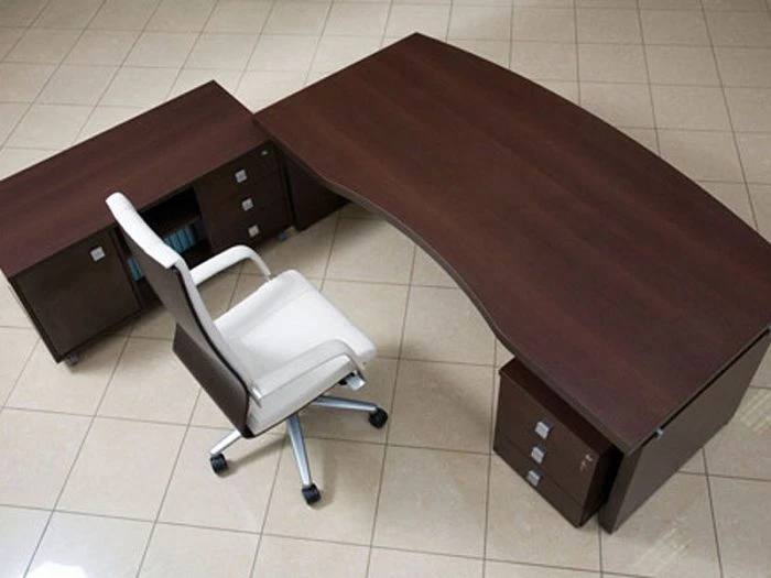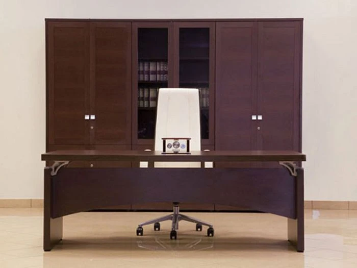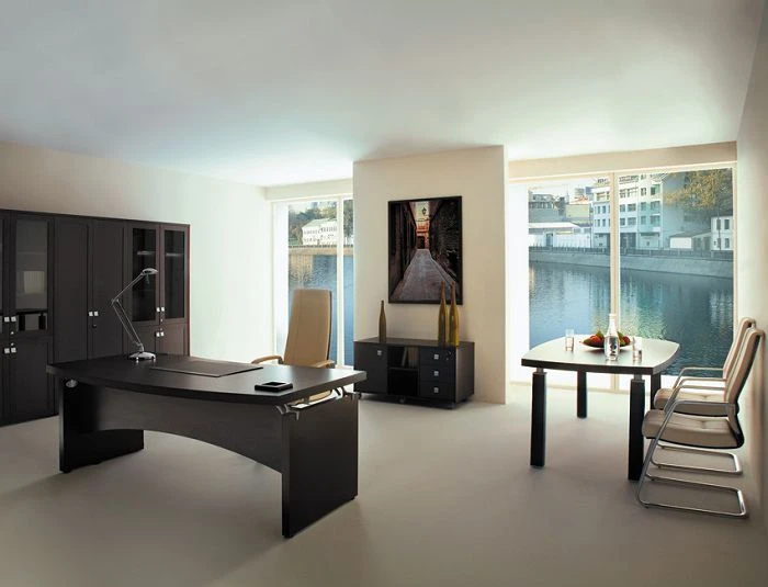 В состав целого комплекта входят: стол руководителя, журнальные столики (с металлическими или деревянными опорами), столы для переговоров, шкафы для документов различных форматов, тумба выкатная и для оргтехники. Все ящики тумб оборудованы доводчиками и центральным замком.