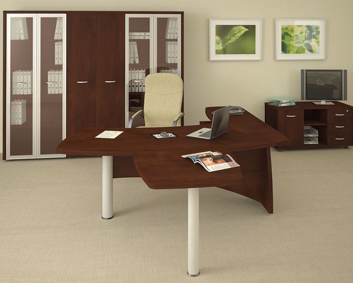 Данный кабинет руководителя доступен в трех цветах. Первый из них – орех. Это стандартный, спокойный и приятный глазу оттенок. К нему можно подобрать светлую обивку и аксессуары, тогда все оформление помещение будет выглядеть по-деловому, но вместе с тем не скучно.